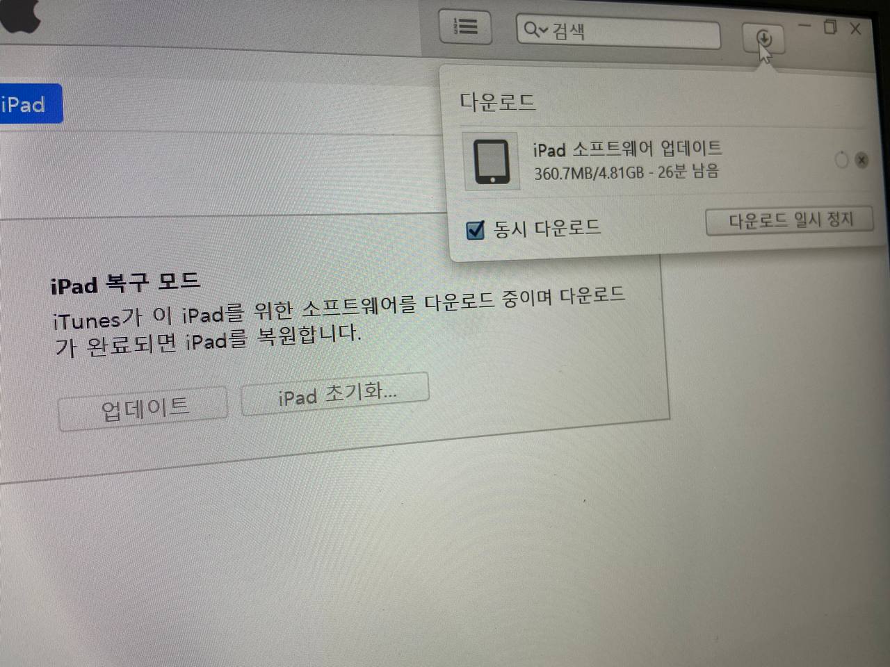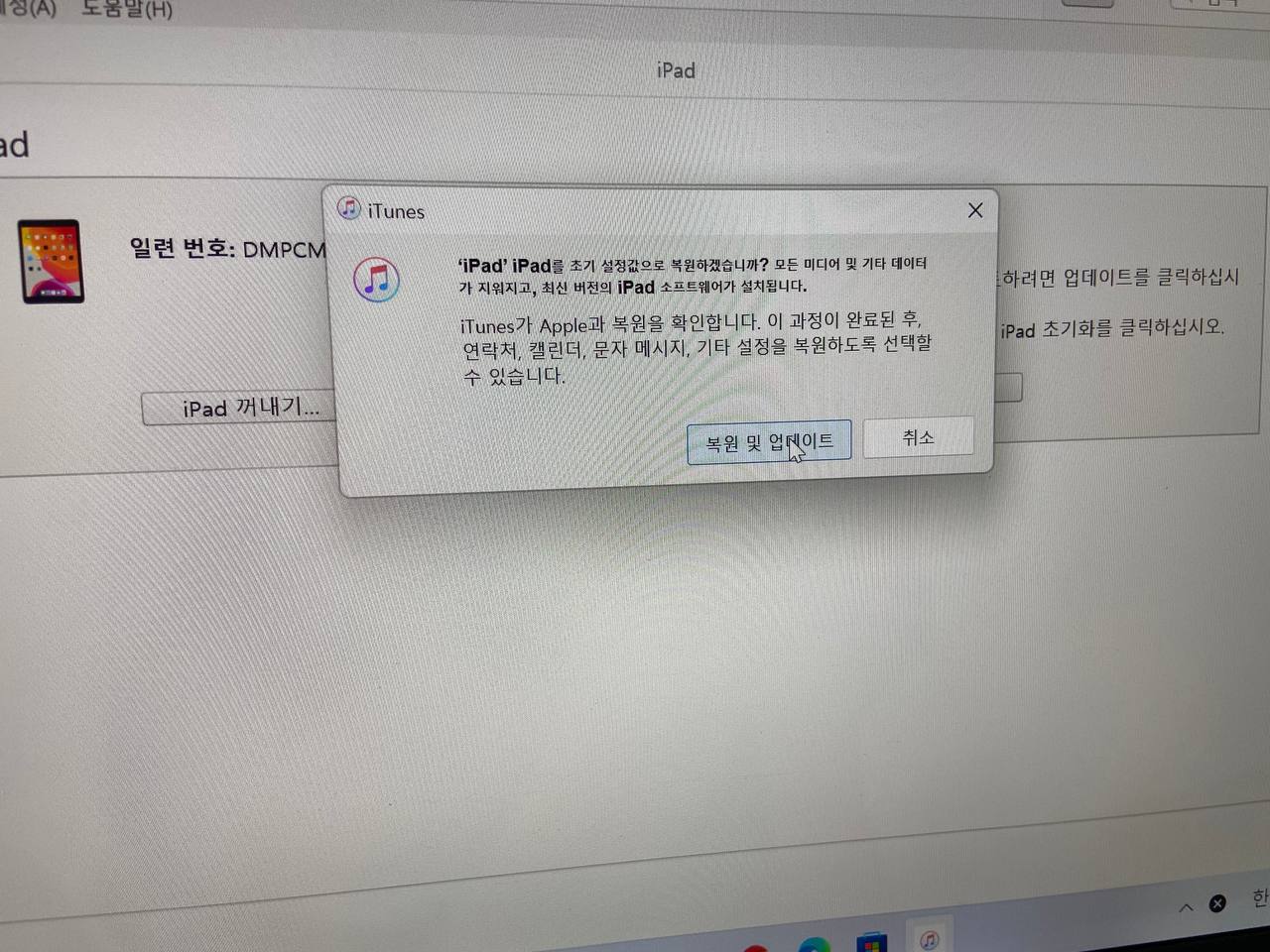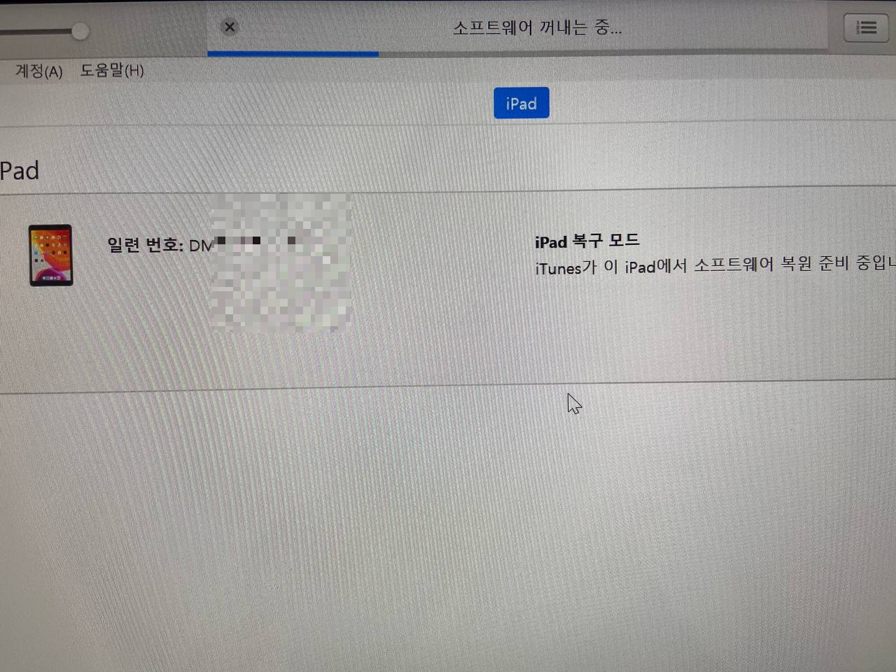 당황하지 않고 다시 처음부터 전원끄기-홈버튼+전원버튼 꾸욱하여 pc랑 연결-복원 클릭 순서대로 진행했습니다.