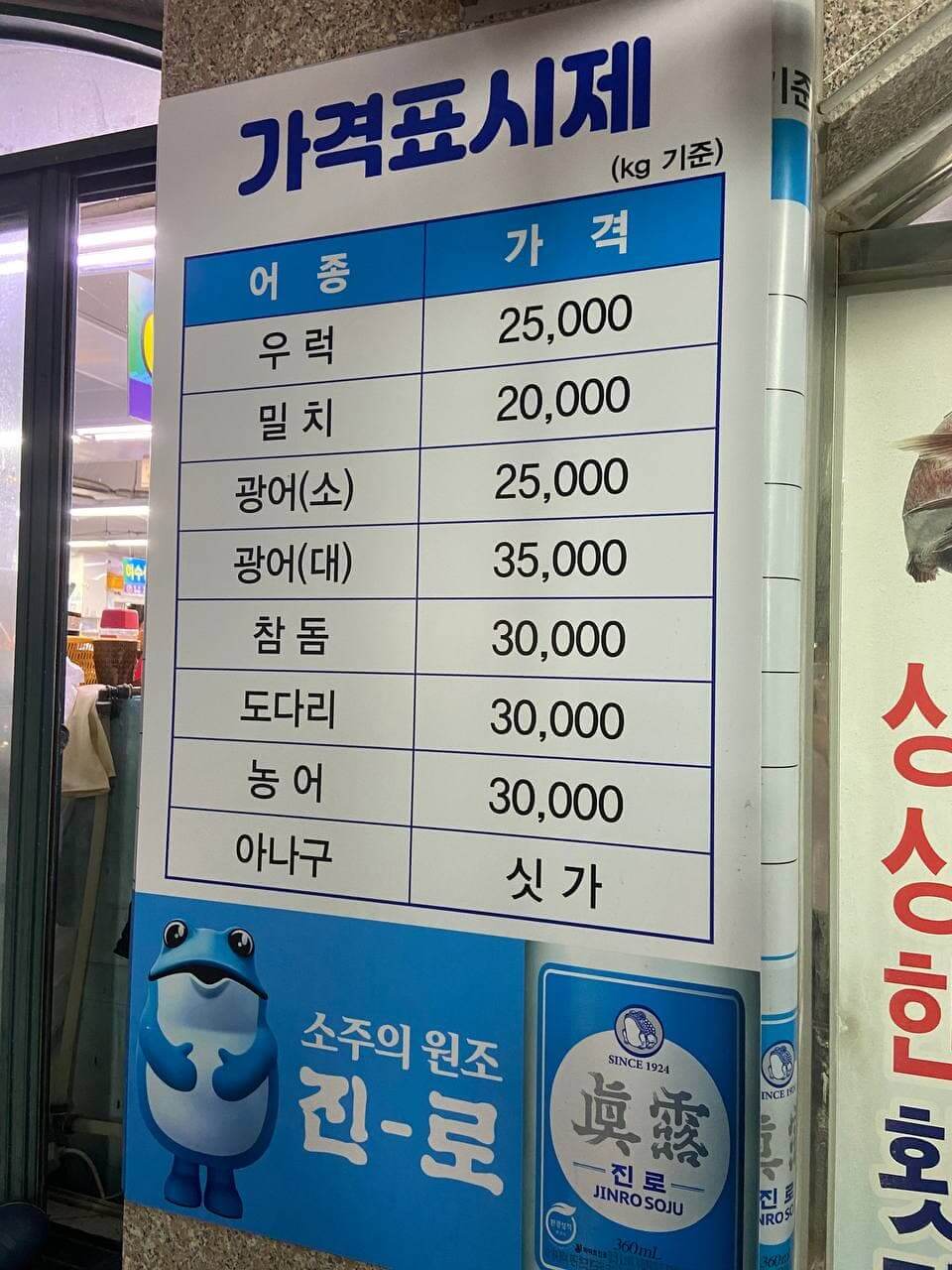 이 곳은 회 가격이 지정이 되어있는데